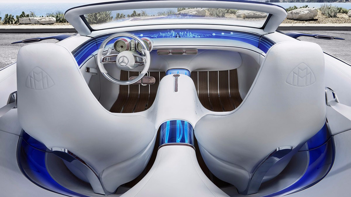 • At Pebble Beach Golf Course this weekend, Mercedes Benz has unvieled their latest concept car to the mass public. Last year, MercedesBenz-Maybach made a large noise as they released the concept of the Mercedes-Maybach Vision 6 but this year the rendition returns but topless. Dubbed the ‘Mercedes Benz- Maybach Vision 6 Cabriolet‘, this 19-foot long, 750 horsepower electric motor, from 0 to 60 in 4 seconds phenom is all the rage. Accompained by multi-spoked rims, exaggerated grill and a custom leather interior, this rendition looks like a scene straight from animation movie The Jetsons. Additional features are the storage compartment underneath the extended hood, which includes everything from custom luggage to cutlery, which truly rounds out the “wow” factor.
