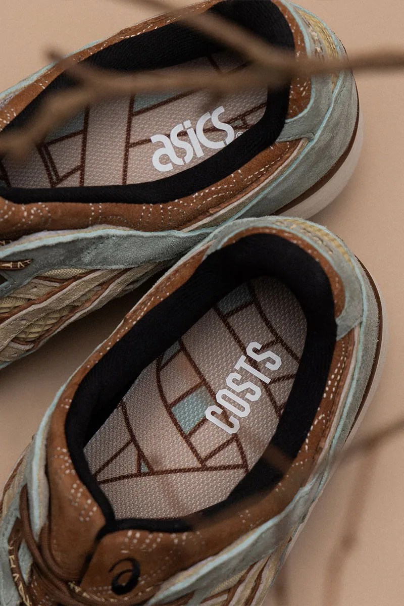 Throughout the shoe design, you will spot more symbolic design notes such as the olive-green vines representing the partnership between COSTS and ASICS. You will notice lychee vine prints and themes detailed on the shoes split tongue, shoelaces and even the sock-liner. The most noticeable of features are the embroidered “COSTS” and “ASICS” branding that is placed on the heel accompanied by the Chinese writing of “extend” in green thread.